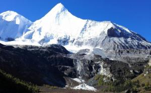 央迈勇藏语意为:文殊菩萨,位于亚丁自然保护区内,海拔5958米,为亚丁三怙主雪山的南峰,位列三怙主之首。稻城三神山中最具有视觉震撼力的一座,三角形的主峰展现出俊朗,挺拔的身姿。諾荣牛场是观看其主峰的理想之地,从牛场出发往牛奶海的路上有一片草滩可以一览其主峰的全景。五彩海旁边的山脊上能够饱览其由五座主峰组成的大全景。