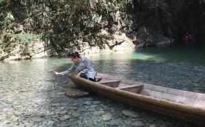 屏山峡谷距离鹤峰县城东去约10公里。历代土司王把爵府均建于屏山,今天还存有许多土司爵府遗址。屏山四周峭壁悬空,在峡谷中的水面游弋,抬头看去,四周峭壁耸立,溪流环绕。船只行驶在清澈的河道中,如同漂浮在透明的镜面,神奇的景象让屏山峡谷声名大噪,被誉为中国的“仙本那”,这样的小船被称为“太空船”。