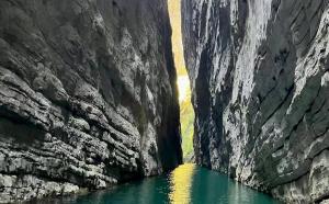 屏山风景区距离鹤峰县城约11公里,这里地势险要,风光奇特,四壁峭壁耸立,碧水环绕,青山翠绿,构成了十分罕见的地缝风光。深入谷底,地缝河面的水上风光更为旖旎独特,美妙绝伦。地缝的河水清澈见底,游船行进在河面上,犹如悬浮在空中一般,真令人叫绝!