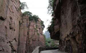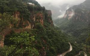 “太行天路”景区位于太行山之巅,北起桃花谷景区,南至仙霞谷景区,全长约30km,既是景区环线游览道路的重要组成部分,也是俯瞰太行山壮美风光的观景台。乘坐观光车游走于太行天路,犹如置身百里画廊,满眼望去,无处不是大气磅礴的国画山水长卷,深邃的峡谷、直立的岩壁,带给游客强烈的视觉震慑。