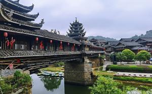 龙津风雨桥始建于明万历十九年(公元1591年),历经沧桑400余年。历史上几毁几修,一直是湘黔公路交通要塞,也是商贾游客往来云集最繁华的地方,史称“三楚西南第一桥”。龙津风雨桥全长146.7米,宽12.2米,为当今世界第一大风雨桥,2000年12月被载入基尼斯记录。整个风雨桥为全木质架构,无一钉一铆,气势宏大,如一条长龙横惯东西两岸,既保留了侗乡建筑文化品位,又充分体现了当代的园林建筑艺术。