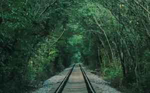 数百米的铁路两旁,繁茂浓密的树林由于过往火车的削磨,形成直直的“墙壁”,两侧树林上方的枝叶几乎要长到一起去,远远望去,就像一条绿色隧道。
