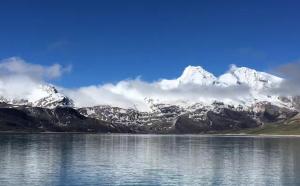 冲巴雍措,位于日喀则市的康马县,喜马拉雅山北坡,处于中国不丹边境,海拔4540米,属高原淡水湖。身后是巨大的喜马拉雅山山脉,冰雪消融,聚集成湖。蓝天白云下,四周的雪山倒影湖中,风景如画,令人惊叹。