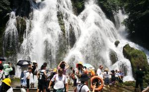 翠谷瀑布坐落在响水河最上游的上、下已定村,是一个封闭的峰丛洼地。此地也是亚洲首档大型自然探索类纪实真人秀《跟着贝尔去冒险》拍摄地。翠谷瀑布悬于群山之腰,是小七孔景区落差最大的瀑布,瀑高60多米,远看似条玉带悬于山间,近探水顺山势倾泻而下,浪花飞溅,水雾蒙蒙,犹如群龙下山,清新悦目。
