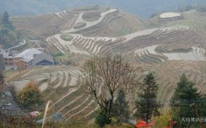 金坑梯田地处龙脊梯田景区的深处,梯田四面群山环绕酷似一个天然大天坑。相比另外两个观景区,这里的地势更为陡峭、梯田的层次错落更繁复,而在这里可以登上更高的观景台纵观全景。由于这个观景区开发得更晚,这里的商业气息相对更少,村寨内依旧保持着更为纯朴的气息。