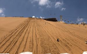沙坡头位于宁夏回族自治区中卫市城区西部腾格里沙漠的东南缘。集大漠、黄河、高山、绿洲为一处,具西北风光之雄奇,兼江南景色之秀美。有中国最大的天然滑沙场,有横跨黄河的“天下黄河第一索”,有黄河文化代表古老水车,有黄河上最古老的运输工具羊皮筏子,有沙漠中难得一见的海市蜃楼。可以骑骆驼穿越腾格里沙漠,可以乘坐越野车沙海冲浪,咫尺之间可以领略大漠孤烟、长河落日的奇观。