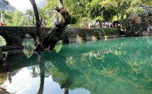 鸳鸯湖是一个天然的喀斯特高原湖,划船入内仔细观察,这里的树木植根于水中的石头,又透过石头扎根于河床。由于地形、水深和光线的变化,可以看到五颜六色的景色。