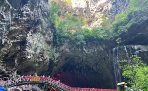 洞天仙境集天坑、溶洞之景于一体,坑洞相连,非常奇特。这里天坑密布,绿树成荫,洞内形态各异的钟乳石错落其中,在景观灯的照耀下,绚丽斑斓,游人泛舟而过,可谓“别有洞天”。游玩洞天仙境,可以沿着栈道漫步,欣赏周围怪石嶙峋,绿树成荫的绝美景色,也可以体验透过一个个天坑仰望天空的奇特景色。