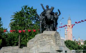 阿塔图尔克纪念碑在安塔利亚老城车站旁的广场上,阿塔图尔克是土耳其的灵魂导师,几乎每个城市都有他的雕塑,他们是土耳其的国父,深受土耳其人民的爱戴,雕像周围是个大广场,很多人聚集在这里,非常的热闹。