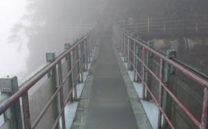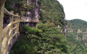 青云栈道在明月山山顶,是欣赏明月山风景的独特位置,拥有“绝壁览胜”一大景观,位于海拔1700米处,全长3100米左右,常年云雾缭绕,行走其上,有平步青云之感。悬空的栈道横亘于悬崖峭壁上,如盘云的游龙。崖壁上,迎客松及各类灌木点缀左右,形态万千,是最受游客喜爱的景致。