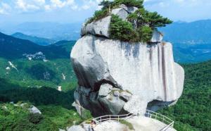 明堂山距离岳西县42公里,相传因汉武帝封禅天柱山时在此设置祭拜的“明堂”而得名。明堂山主峰海拔1563米,景区的风光和天柱山类似,奇峰异石,松柏顽强地生长在岩石上,因山脚有瀑布和水潭可看,所以比天柱山又多了几分秀气。