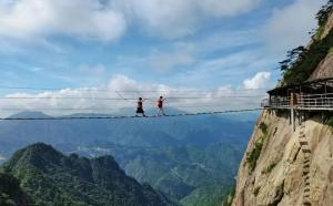 明堂山高空栈道由绝壁栈道、玻璃栈道、玻璃屋、玻璃眺望台及玻璃桥构成,总长 1300米,宽1.5米至2米,落差达400米。沿崖壁修建,环绕主峰景区(天子峰、神女峰、圣母峰)一周,形成“四面看景”的独特风光。被誉为“华东第一玻璃栈道”。