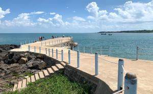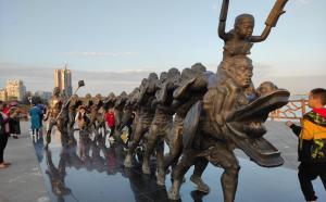 金沙湾,位于广东省湛江市赤坎区东海岸,占地面积12.6万平方米。是国家AAAA级景区,有金沙湾观海长廊、海滨浴场,双子岛、水上运动中心等景点。宽阔笔直的军民路,种植了各种热带的道路隔离带与两旁绿化带;金沙湾观海长廊的碧海椰风,更是令人心旷神怡,物我两忘。
