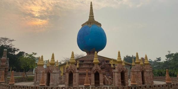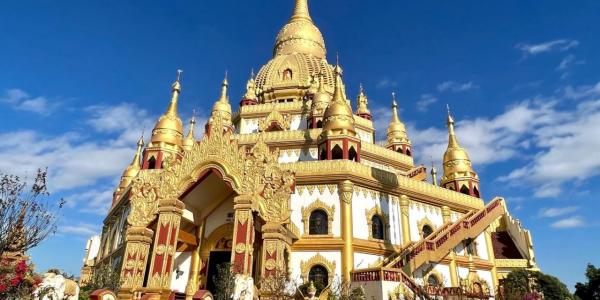 勐焕大金塔座落在云南省德宏州州府-芒市东南部孔雀湖畔的雷牙让山顶。青山绿水间的“勐焕大金塔”光彩夺目,金光灿灿,显得雄伟壮观,是芒市标志性的建筑,也是生活在这里的傣族人民的圣地。传说“释加牟尼”生前转世为金鸡时曾生活于此地。
