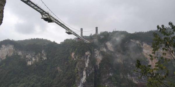 张家界大峡谷玻璃桥,名“云天渡”,位于湖南省张家界大峡谷景区栗树垭和吴王坡区域内,是一座景观桥梁,兼具景区行人通行、游览、蹦极、溜索、T台等功能。桥面长375米,宽6米,桥面距谷底相对高度约300米。这座全透明玻璃桥长度、高度位居世界第一。玻璃桥为世界首座斜拉式高山峡谷玻璃桥,并创下世界最高最长玻璃桥、首次使用新型复合材料建造桥梁等多项世界之最。![]()