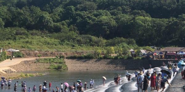 游览后食用午餐,下午适时前往【阶梯瀑布】,鹅卵石铺筑的坝顶蜿蜒曲折的叠式堰坝,倾泻而下的水流形成层层叠叠的白色水花,成群的游客或嬉水,或拍照,非常热闹。