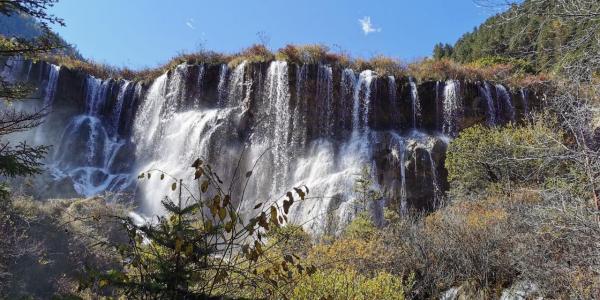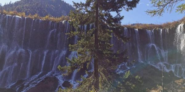 诺日朗瀑布位于诺日朗游客中心附近,是中国大型钙化瀑布之一。瀑布宽270米,高24.5米,也是中国最宽的瀑布,众多的影视剧曾在这里取景,包括中央电视台1986年版电视剧《西游记》的片尾就是在这里拍摄的。2017年8月地震被毁现在已经修复开放。在观景台上,瀑布全景尽收眼底,秋季时,瀑布的三百米飞流在秋色、云雾的衬托下,化成了一幕波澜壮阔的画面。