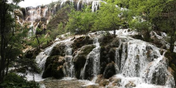 珍珠滩瀑布,是九寨沟最大的钙华瀑布,来自山中融化的雪水,从21米的高处冲进谷底,吼声如雷,卷起千堆浪花,这道激流水色泛白,是九寨沟所有激流中水势最猛,水声最大的一段。激流左侧栈道,是观赏瀑布的最佳点。珍珠滩瀑布瀑布底部空气清新,林木茂盛,踩着栈道,在激流的陪伴下继续东行,就到了珍珠滩东侧。瀑布的水因为含硫量高,不能饮用。