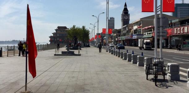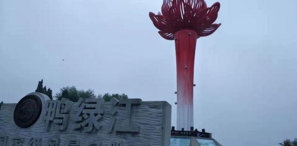 因为在服务区睡觉了,所以我们到鸭绿江断桥时,天已经亮了,雾蒙蒙的。到处悬挂五星红旗,为祖国母亲庆生