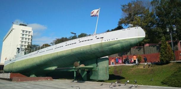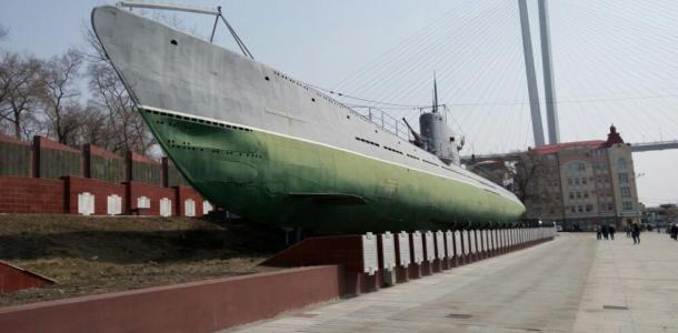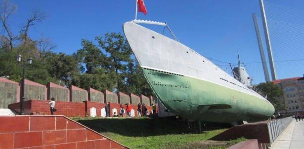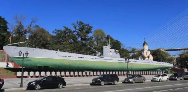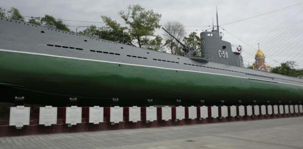 二战期间战功显赫的C-56号潜水艇,这艘潜水艇的各个部件先在列宁格勒制造,然后装上火车,经过上万公里的长途跋涉,运到海参崴组装完成后,编入太平洋舰队。卫国战争爆发后,C-56和其他三艘潜艇一起,被调往欧洲战场。于是它从海参崴出发后,横越太平洋,穿过巴拿马运河,进入大西洋,行程近30000公里,最后抵达北欧海域,在那里与德国海军展开战斗。到战争结束时,带着击沉德国军舰十余艘,重创4艘的辉煌战绩而自己丝毫无损,功不可没。C-56重新回到海参崴,完成了它的“环球航行”。博物馆建在了潜水艇里。潜艇长77米,宽5米