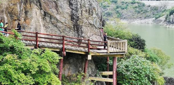 石门栈道进去以后一路有各种描述西周、两汉、三国和近代故事的塑像和壁画,走到真正栈道还需要一段路,但是这沿途也有挺多可以看的了,适合游玩拍照,还会路过一个道观,有时间也值得去看看。 栈道在水库大坝附近,只有一小段,是近期重修的