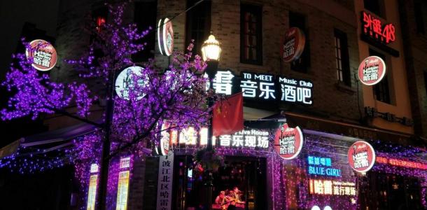 老外滩街道保留了历史建筑,改造成了休闲娱乐为主的酒吧街。夜晚时分,整个街区被各色灯光萦绕,充斥着或喧哗或清新的音乐,各种类型酒吧混合在一起没有区分类型,以至于感觉在互相影响却又相互依赖。