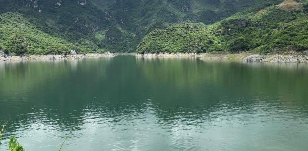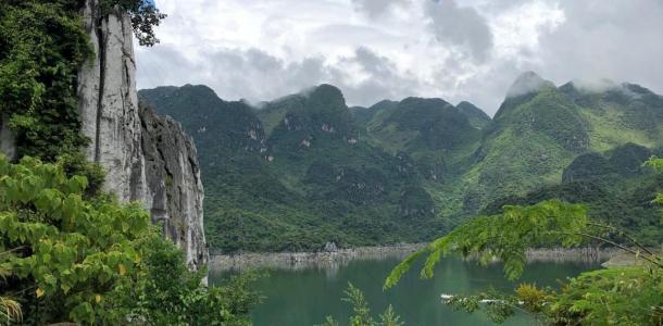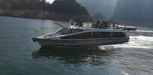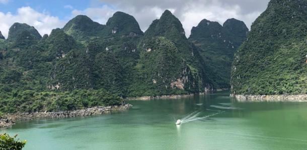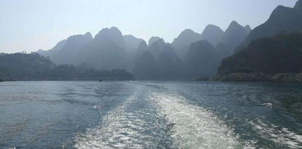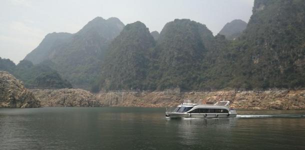 万峰湖是建坝形成的人工湖,面积可不小,70多个西湖的大小在加上万峰林余脉的加分,让它也有了一定的欣赏价值。 这个不要门票的所在,并没有太多的游人,可能是旅行社没有什么油水,为了进一步避开人潮,选择了更远的码头坐船,结果这次真的人少,为了等人拼船可算苦等,最后好在来了一家爽快的温州游客,我俩才算用最小的成本坐上快艇