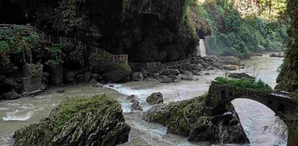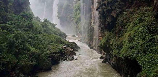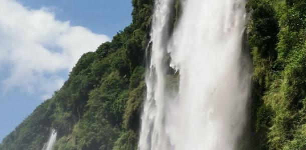 马岭河峡谷是万峰林中一条神秘的地缝。游马岭河峡谷,可乘船,也可沿河漂流。站在峡谷底部仰望瀑布,汹涌澎湃的瀑布从天而降。翻滚着白色水花,飞溅着如玉水珠。似银河泻落,水雾蒙蒙。涛涛水声响彻四周。