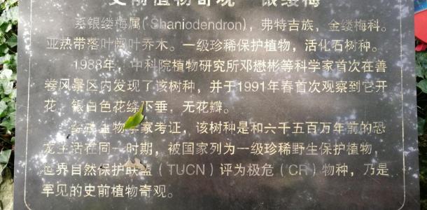 善卷洞外的山林中,有几棵特别的树。它们被称为恐龙时代的珍稀植物—银缕梅。它会开花结果,果实成熟后,会自然爆裂,种子遇到合适的土壤就会生根发芽成长......至今国内外植物学家用采集的种子经过多年研究培育,均没有栽种成功。