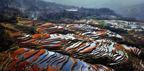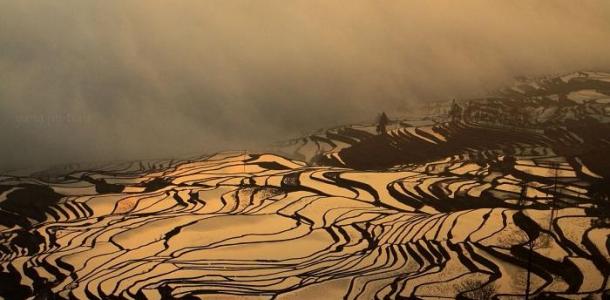 崇山峻岭中,一座座山坡上几千级梯田倾泻而下,这面与面、线与面、线与线的交汇,是上帝精心打翻的调色盘。这片神奇的土地,是位于云南省元阳