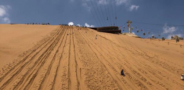 作为沙漠主题的景点而言,沙坡头在娱乐性上是做的最好的,当然我是指以娱乐为目的,如果是以观景或探险为目的,可以往更大更深的沙漠去,景观也更原始壮观,但大多数人去沙漠仅仅是为了安全的体验一下风情,参与一下项目,那沙坡头是非常不错的选择。所谓沙坡头其实也就是腾格里沙漠最靠近中卫市区的那一片,当年王维在这里写下了长河落日圆,大漠孤烟直的千古名句。景区很大,分为黄河区和沙漠区,项目主要有游艇、羊皮筏、滑索、滑沙、骑骆驼、沙漠冲浪、滑翔七种,其中滑索和滑翔是单买项目,每个100元,其余五个打包联票285元,推荐买这个