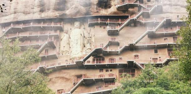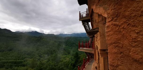 麦积山石窟是中国佛教四大石窟之一,被称为东方雕塑馆的麦积山石窟的一个显著特点是洞窟所处位置极其惊险,大都开凿在悬崖峭壁之上,洞窟之间全靠架设在崖面上的凌空栈道通达。古人曾称赞这些工程:“峭壁之间,镌石成佛,万龛千