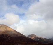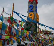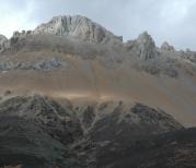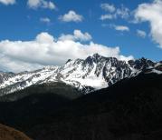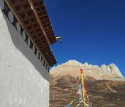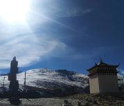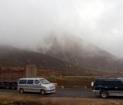 盘山公路爬上来是白马雪山,可以看见正面的一座山上还有一些白雪。上午在奔子栏,警察设卡拦车并告之白马雪山由于大风雪需封山,任何车辆不得通行,中午在东竹林寺附近再有警察设卡,但这回却说白马雪山可上,前提是必须四驱车或上防滑链的车才能上山,而且须司机签名画押并留联络方式……感觉像签生死状,呵呵。