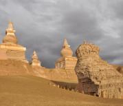 黑水城,西夏首都。被元朝占领,后明军攻破并废弃该城。1908年俄国人在多次探寻被当地牧民纷纷引入歧途后,终于绑了个蒙古土尔扈特部王爷并借此挖出了黑水城。这是近代中国几大考古发现之一。 城廓保存非常完好,包括两个城门的翁城。城内基本上是残瓦碎石了。黑城、大同城、怪树林是一个景区。每年九十月因胡杨林变黄而成为旺季,景区有摆渡车到各景点。淡季没有摆渡,私家车可以进入。 站在这里看着荒凉的戈壁,想到刚刚路过的大同城,真是无限感慨。