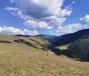 毛垭大草原,路两边是广袤的高原牧场,深深浅浅的绿色在草地上绵廷起伏着,远处是连绵的雪山,在蓝天白云的映衬之下,高原牧场的景色非常美丽。离天近了,云彩也低了。一片博士帽形状的白云在我们的前面飘荡。