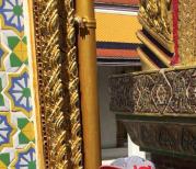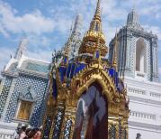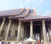 玉佛寺游客非常多,非常壮观的!整个的感觉就是金碧辉煌!里面的建筑也是各具特色!格鲁达小人表情各异,甚是可爱!蓝天白云的映衬下就更美了!玉佛寺就在大皇宫的里面,买了大皇宫的门票就可以去玉佛寺参观了,玉佛寺里最珍贵的宝贝当然是玉佛,玉佛寺的玉佛殿面积不大,一分钟都不要就走完了。